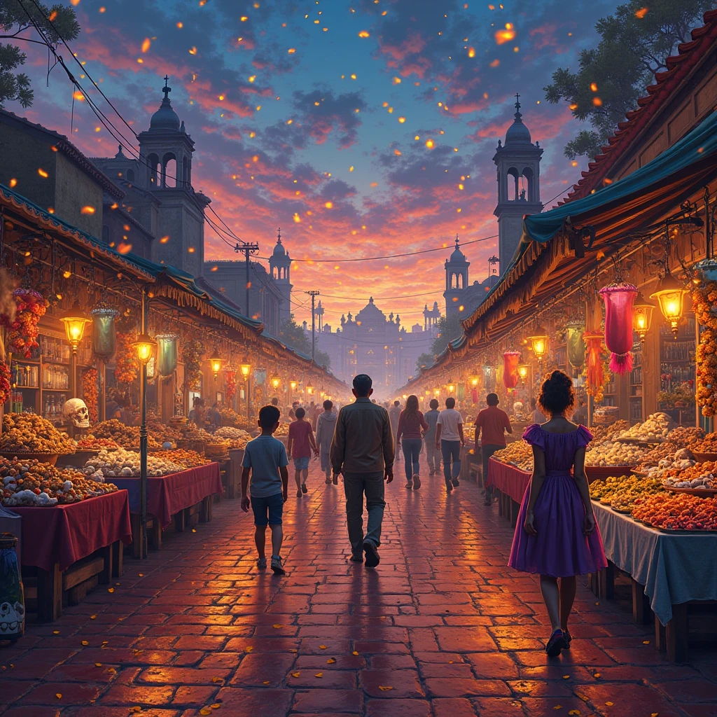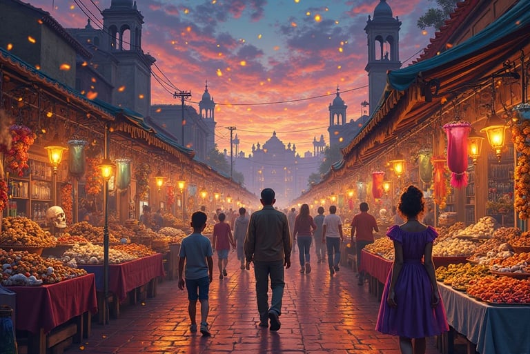 Las pequeñas calaveras de dulce enfrentan los cuadros de papel picado que reproducen alguna escena congelada en el tiempo, decoradas con cruces y lápidas, simulando una cena o un baile e incluso a un hombre entregando la leche como se hacía antaño. Un mercado que rinde tributo a la muerte misma es forzosamente algo que carece de veracidad, y al mismo tiempo, se vuelve más genuino que ninguno otro. Las cuencas de los pequeños cráneos de azúcar o chocolate se rellenan de hojuelas metálicas brillantes, y pierden la agresividad del vacío hasta parecer de nuevo humanas, vivas, y las reconocemos como algo bueno. Entonces los niños revolotean alrededor de los puestos, pululan al ras de las mesas, pidiendo nombres específicos para colocar entre las flores de confitería que adornan las sienes lisas. El recuerdo inevitable de la muerte se vuelve simpático, soportable, hasta que el juego se desborda con las lámparas sobre los espectros de masa que rezan en silencio al lado de tumbas de azúcar y los espectros de tamarindo.