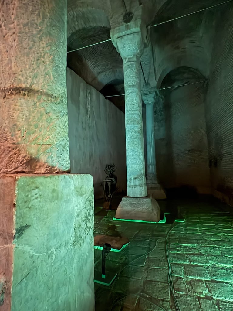 Se encuentran dos columnas que tienen en su base una cabeza de Medusa, el ser mitológico que convierte en piedra a todo a quien mirará.
