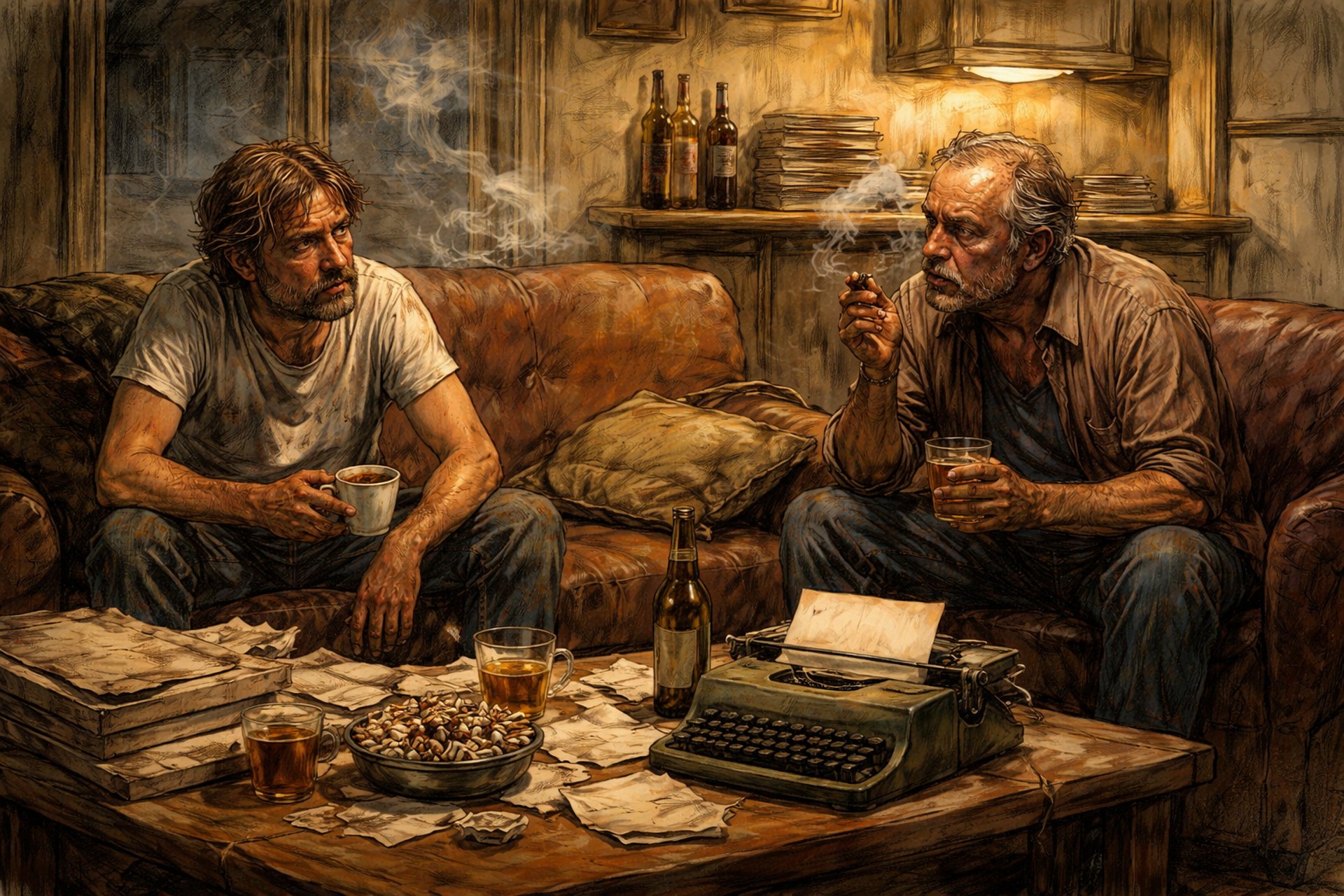 La rutina que Bukowski describe es una rutina de escritores sin obra visible. Café, conversaciones repetidas, cigarrillos, juicios sobre otros. No hay escritura en acto durante la mayor parte del cuento; hay, en cambio, una vigilancia constante del campo literario, una observación resentida de quién triunfa y quién no. La espera no es pasiva, sino tensa: se espera que el mundo reconozca un genio que los propios personajes consideran evidente, pero que nadie más parece percibir.