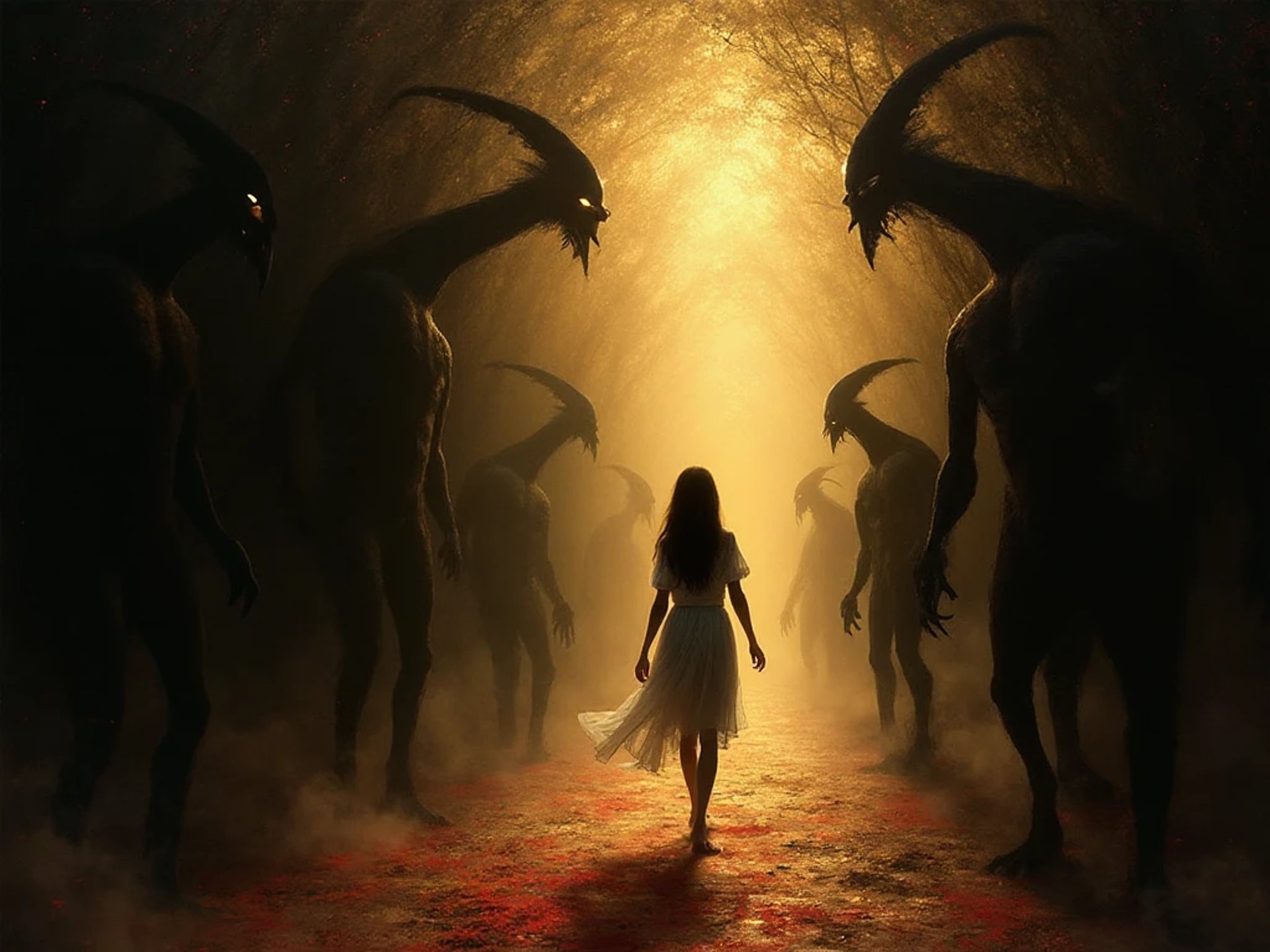Ella se aleja / de monstruos insensibles que ponen precio a todo. / De quienes saben largamente sobre lo superfluo / (no de luchar por lo valioso de la vida) / De quienes enaltecen costumbres estériles. / De quienes se embrutecen persiguiendo lo banal. / De quienes aceptan la mediocridad por miedo a la locura. / De la chapucería y la pura intelectualidad.