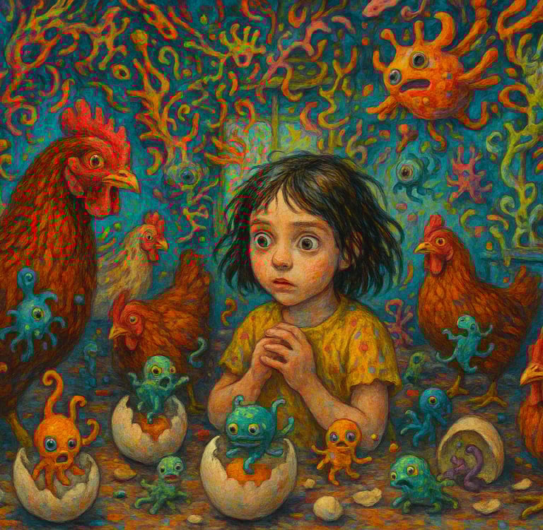 El huevo, símbolo ancestral de nacimiento y continuidad, se convierte aquí en la semilla de lo inagotable. Cada huevo es la promesa de una nueva gallina, y cada gallina trae consigo la posibilidad de más huevos, en una progresión que amenaza con volverse infinita. El ciclo natural de la vida, que en condiciones normales es un proceso equilibrado, aparece deformado hasta volverse monstruoso. Lo que debería ser motivo de celebración —la fecundidad, la abundancia— se convierte en el motor de una proliferación angustiante.