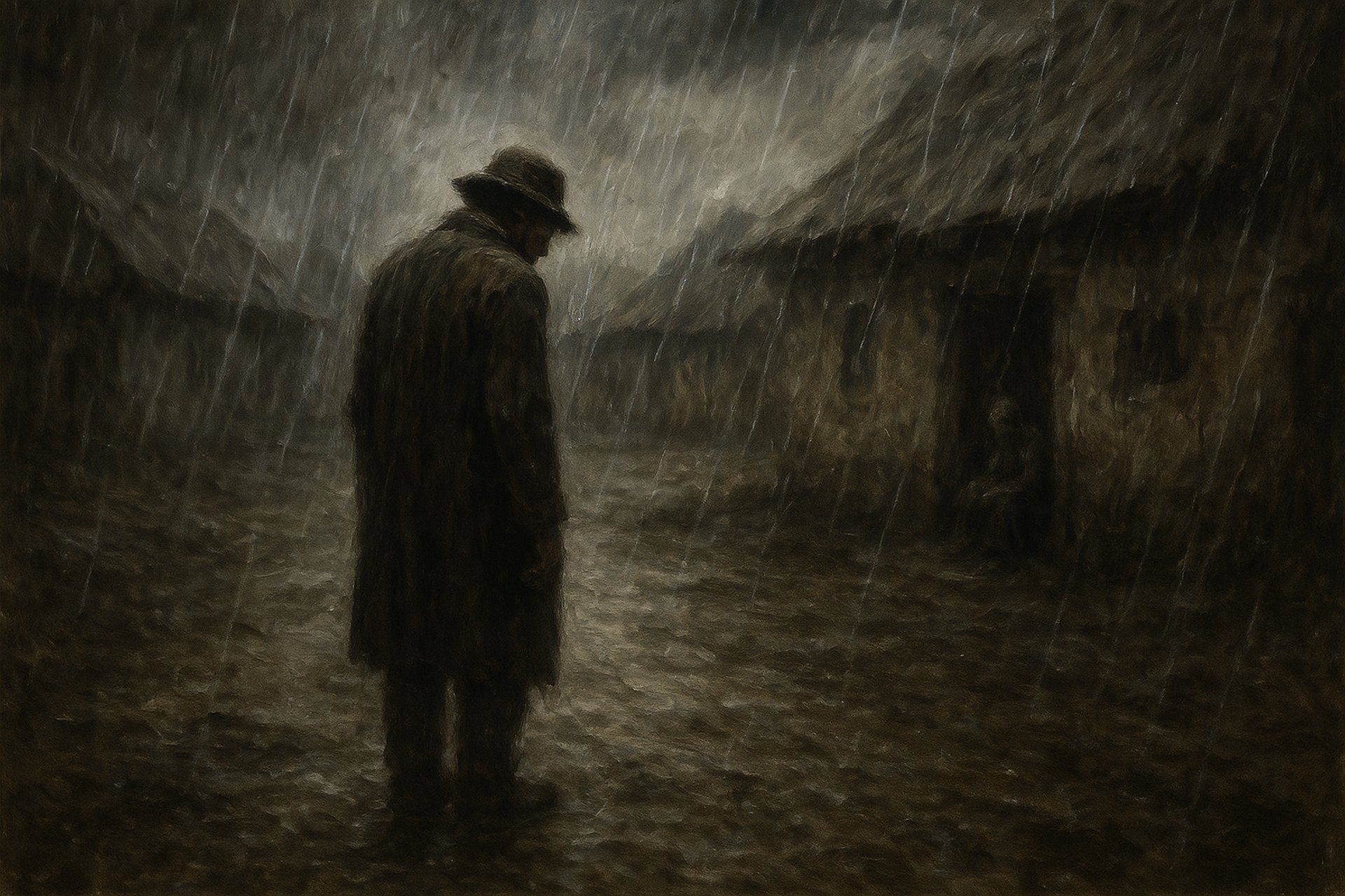 Camino bajo una lluvia que no termina. No es una lluvia de agua, sino de tiempo detenido, de culpas que se deshacen sobre la tierra. Cada gota cae como una palabra no dicha, como el eco de un rezo que ya nadie recuerda. En esta aldea que se hunde lentamente en el barro, escucho las voces de los vivos y de los muertos mezclarse en un murmullo que parece venir del fondo del mundo. Aquí estoy, dentro del universo de El luto humano, y el aire huele a fe perdida.