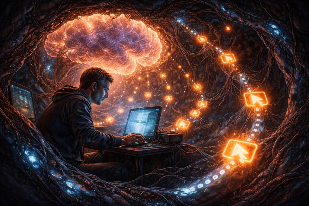 Se encontró dentro de la cabeza como si fuera un cerebro. Confundido, ordenó a sus manos hacer clic. Link lo llevó a capas más profundas de conciencia: se vio atrapado en la cabeza. De nuevo había hecho clic en el enlace. Lo llevó aún más profundo en sí mismo. El impulso subconsciente ordenó que se enviara la señal para que pudiera volver a hacer clic en el enlace…