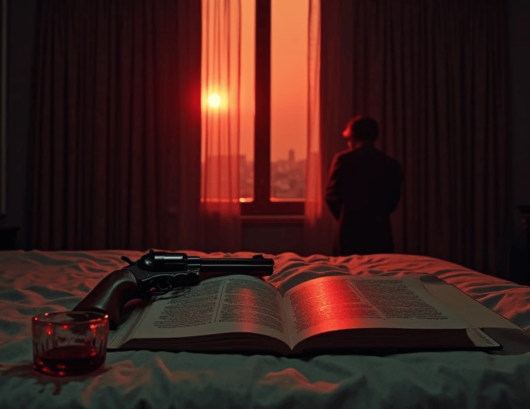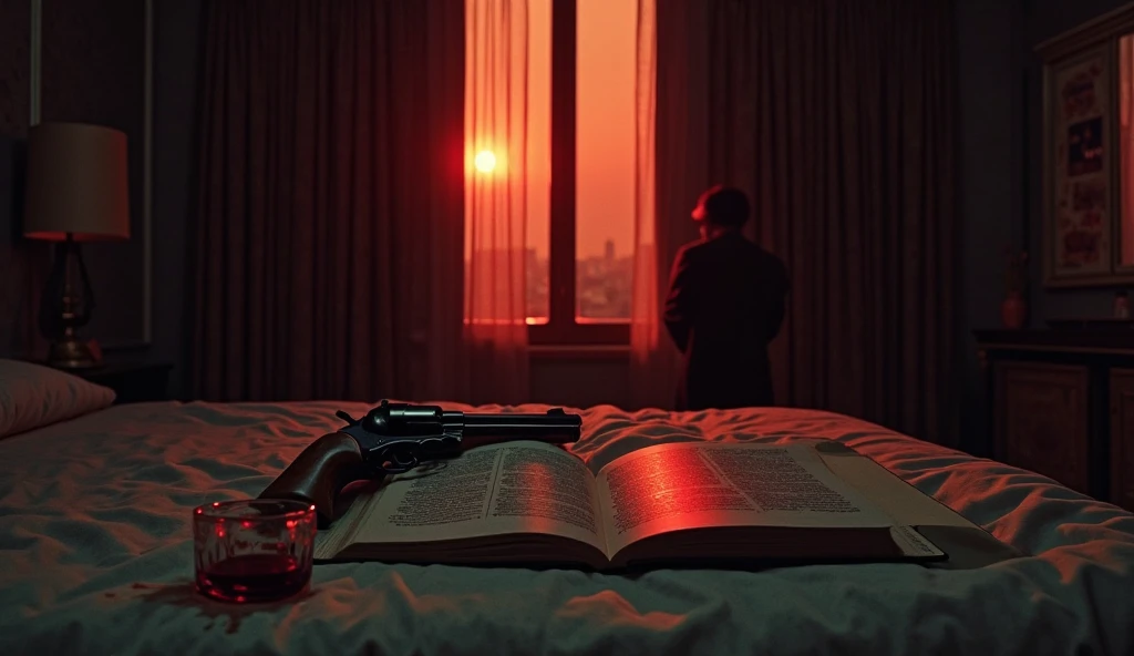 Uno de los primeros elementos que llama la atención en El suicida es la presencia de la Biblia abierta con un versículo marcado en rojo “que lo explicaría todo”. Esta imagen no sólo es poderosa por la carga simbólica que implica la Biblia en la cultura occidental, sino porque funciona como un indicador de la tensión entre la búsqueda de sentido y la ausencia radical del mismo.