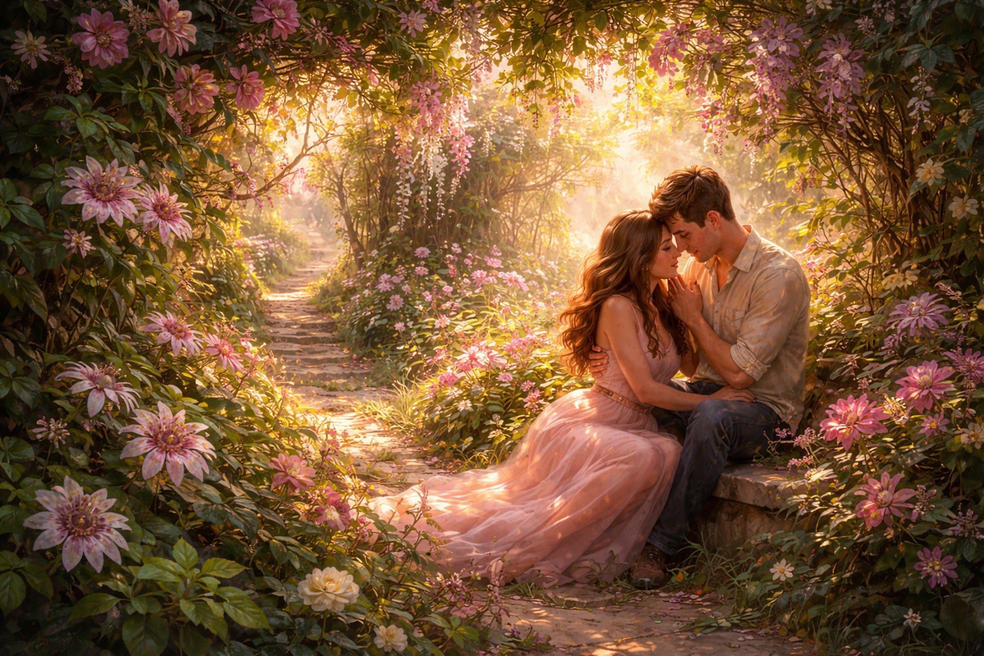 Bajo las hojas verdes y rosadas, / Un secreto se pierde, invisible a los ojos. / Los caminos ondulados, las flores escondidas, / Esto lleva a una eterna sorpresa.