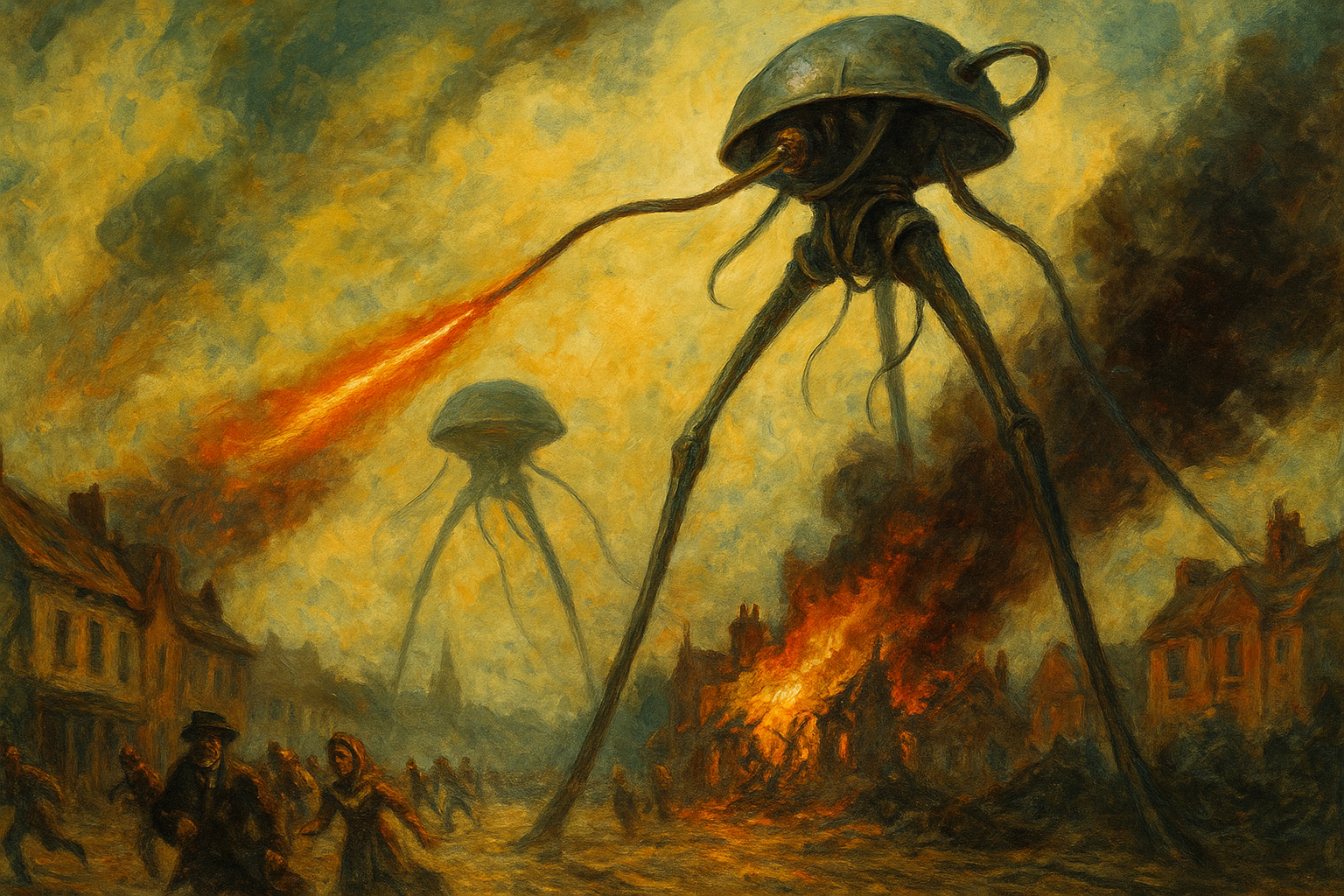 Los trípodes marcianos —altos, ágiles, fríos— parecen diseñados para aplastar sin esfuerzo. Frente a ellos, los humanos corren, caen, sangran. El contraste es casi obsceno. Y sin embargo, en esa desigualdad radical, Wells no cae en el nihilismo. Al contrario: subraya la resistencia elemental del cuerpo, su capacidad de seguir, de esconderse, de arrastrarse si es necesario. No hay gloria, pero hay supervivencia.
