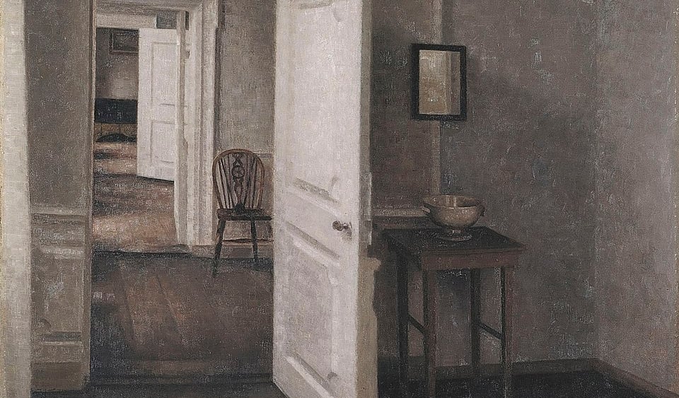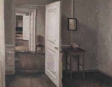 Vilhelm Hammershøi pintó repetidamente los interiores de su departamento en Strandgade, en Copenhague, a lo largo de varios años. Lejos de tratarse de un ejercicio meramente doméstico o autobiográfico, estas habitaciones se convirtieron en un laboratorio visual donde el artista exploró la relación entre espacio, tiempo y percepción. Las variaciones entre una versión y otra son mínimas: una puerta entreabierta, un muro desnudo, un cambio casi imperceptible de luz. Sin embargo, en esa insistencia se revela una apuesta radical: hacer del interior un lugar donde la pintura no representa, sino que observa.