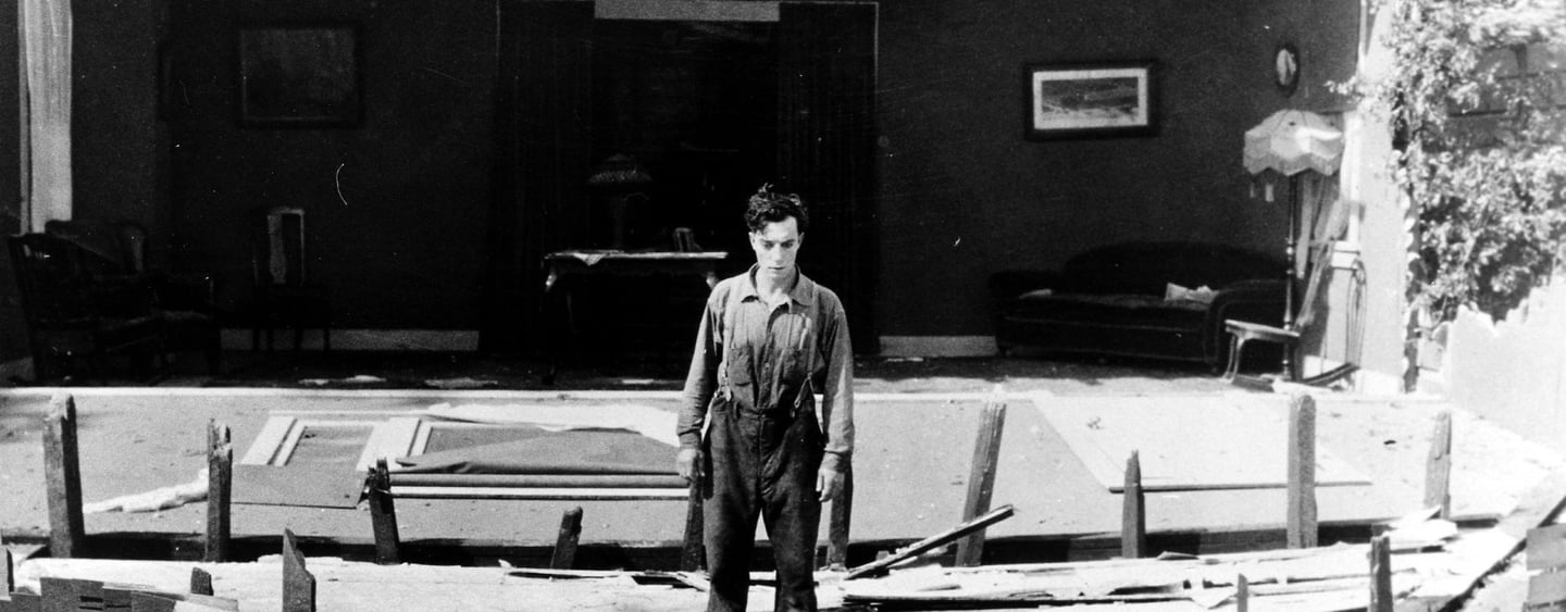 Una de las escenas más célebres de la historia del cine ocurre en Steamboat Bill Jr., cuando la fachada completa de una casa cae hacia adelante mientras Buster Keaton permanece inmóvil frente a la cámara. La estructura, construida en tamaño real, se desploma sobre el actor con una precisión calculada: Keaton se salva únicamente porque su cuerpo coincide exactamente con el espacio vacío de una ventana. El plano se filmó sin trucos ni efectos especiales. Si el actor hubiera estado apenas unos centímetros fuera de lugar, el peso del edificio lo habría aplastado. Esta escena resume el espíritu de su cine: una comedia que surge del equilibrio entre el peligro real, la precisión técnica y la absoluta confianza en el poder de la imagen.