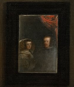 El espejo al fondo de Las meninas es, quizá, el dispositivo más perturbador de toda la composición. No ocupa un lugar central ni reclama la atención inmediata, pero una vez advertido reorganiza por completo la lectura del cuadro. En su superficie aparecen reflejados los reyes, Felipe IV y Mariana de Austria, figuras ausentes del espacio pictórico y, sin embargo, determinantes para comprenderlo. Su presencia espectral introduce una paradoja visual: aquello que no está en la escena gobierna su sentido. Velázquez convierte así al espejo en un umbral entre lo visible y lo invisible, entre la representación directa y la sugerida.