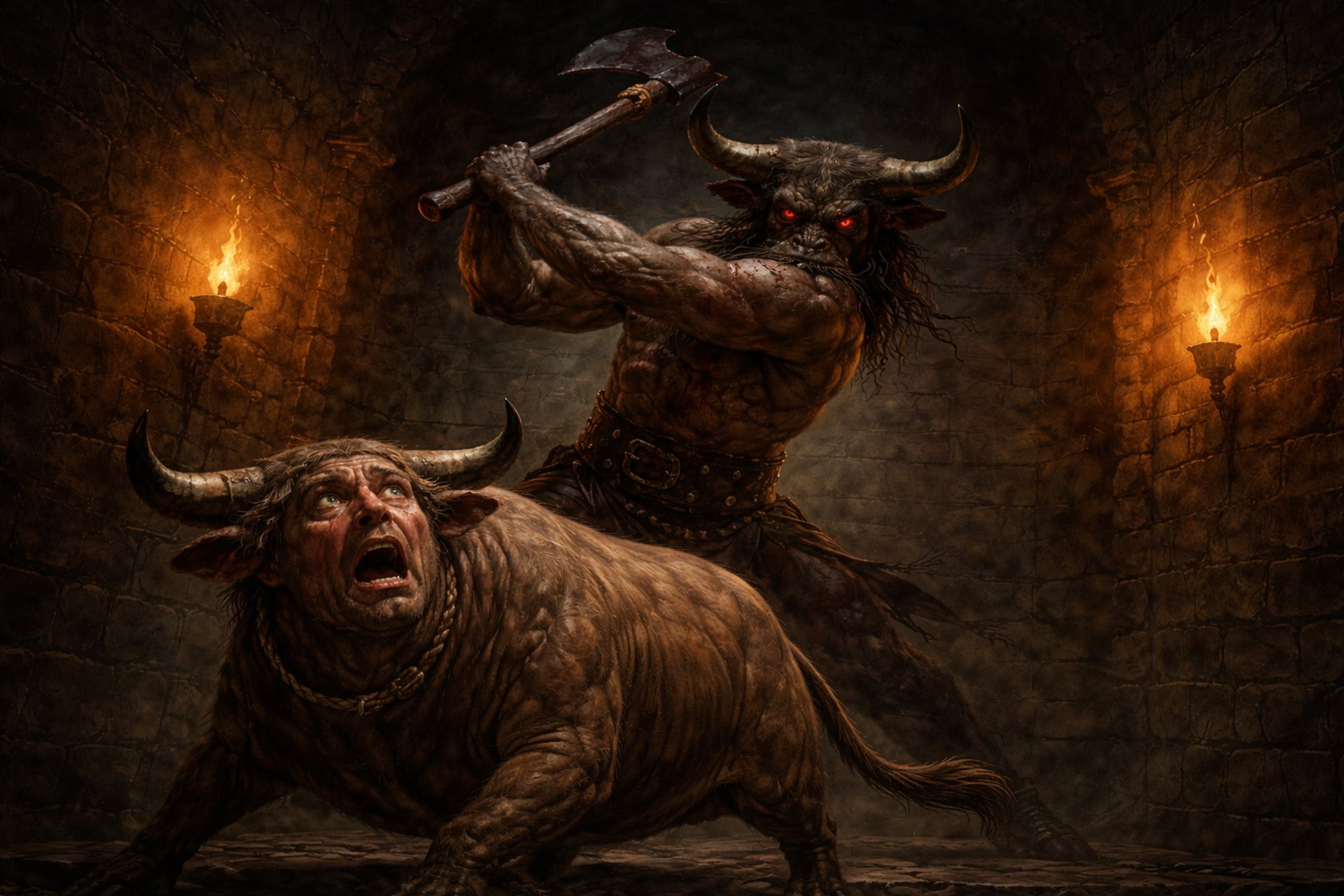 El hombre-toro intentó huir, pero su cuerpo era exactamente lo que él siempre había castigado: una máquina lenta, torpe, diseñada para recibir el daño, no para esquivarlo. El corral se convirtió en una celda de aire sólido. Cuando el hacha se alzó, el hombre atrapado en el animal no imploró perdón; el lenguaje lo había abandonado mucho antes que su forma.