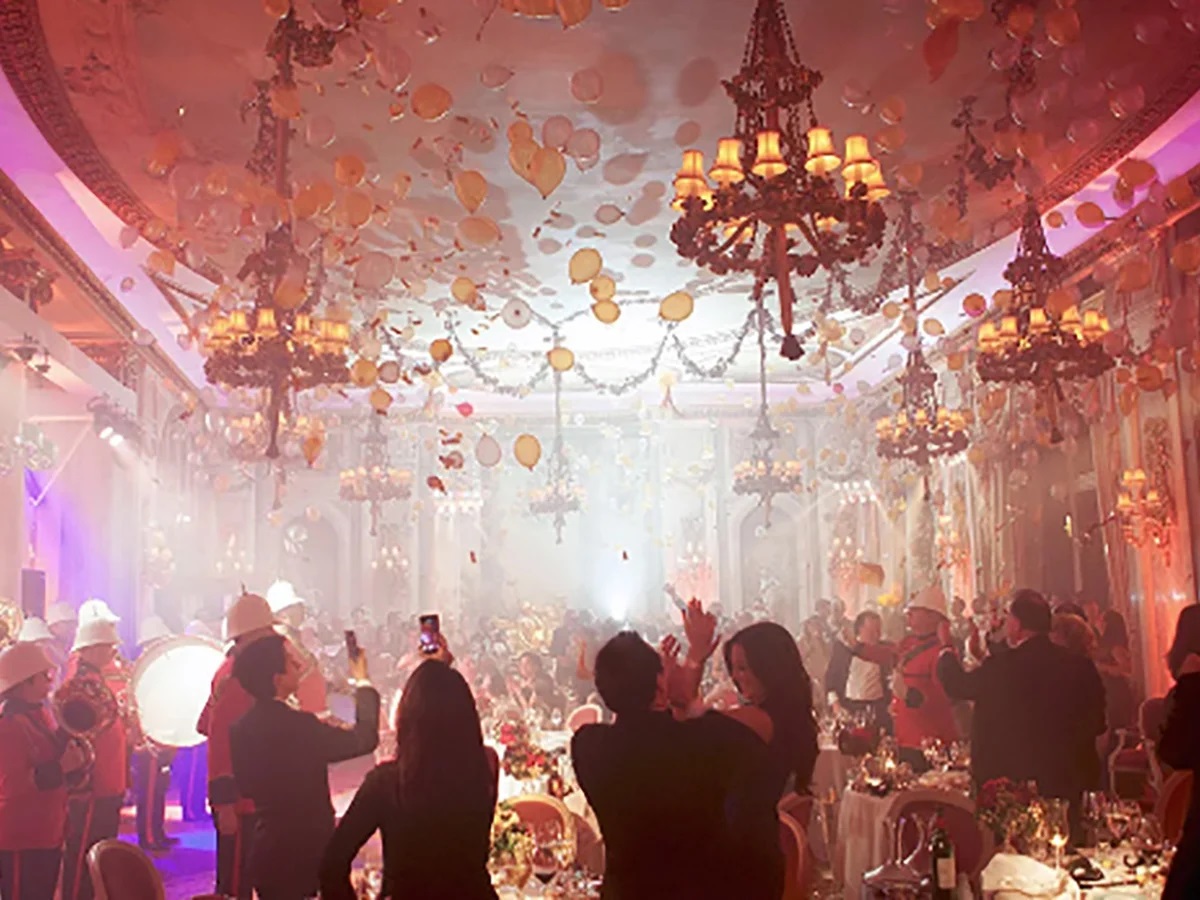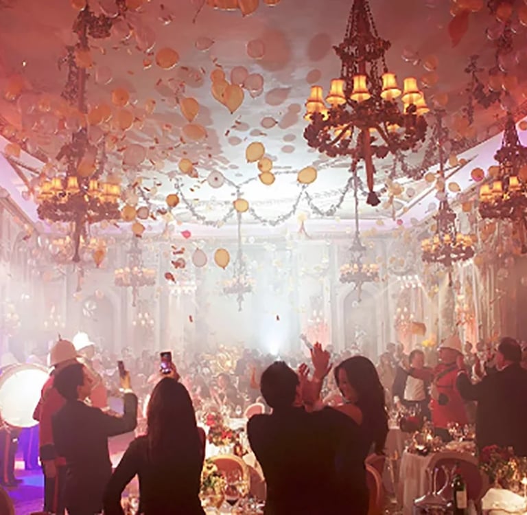 Una fiesta de gala, un salón rojo, con rojas cortinas y grandes candelabros alumbrando con lúgubres sombras las paredes en una danza de figuras fantasmales.