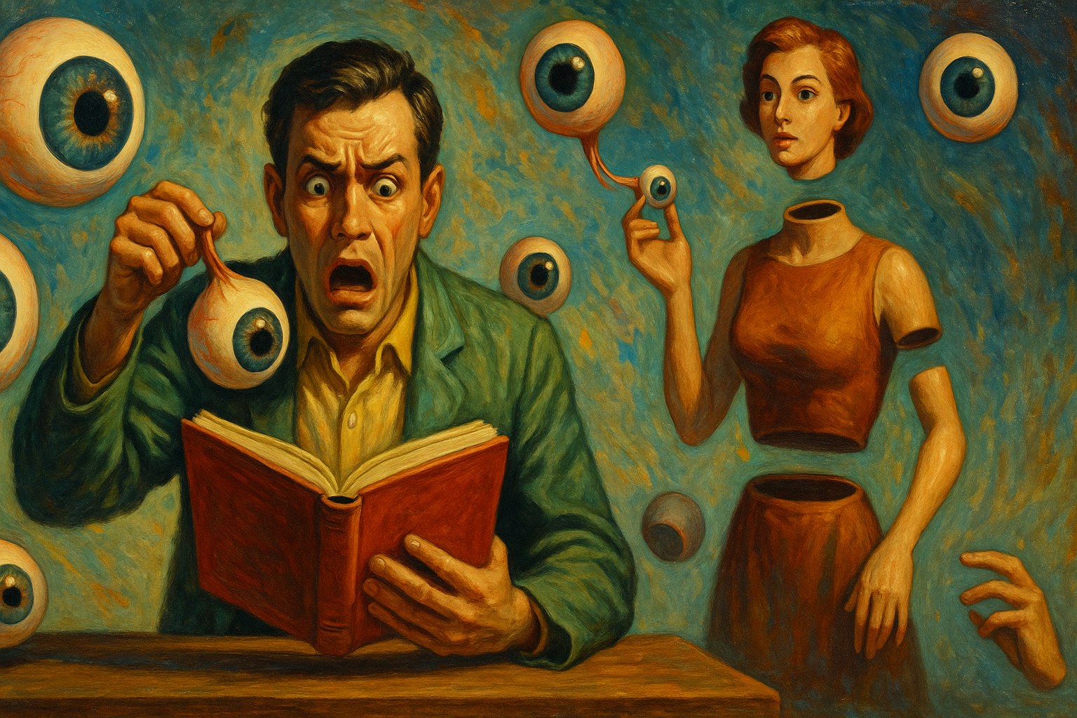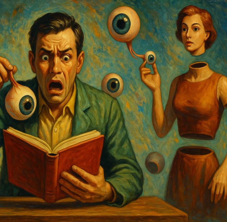 Cuando lee expresiones como “ella le clavó los ojos”, “él echó una mirada”, “se tragó la vista”, o “ella tenía los ojos en la nuca”, el narrador no las interpreta como simples metáforas o figuras del lenguaje. En lugar de entender que estos giros expresan emociones, actitudes o formas de mirar, cree que son descripciones literales del comportamiento de los personajes. Y, basándose en esta lectura, llega a una conclusión asombrosa: los seres humanos tienen la capacidad de quitarse los ojos, lanzarlos, tragarlos, moverlos libremente por su cuerpo… ¡y todo esto parece escrito con naturalidad en una obra literaria humana!