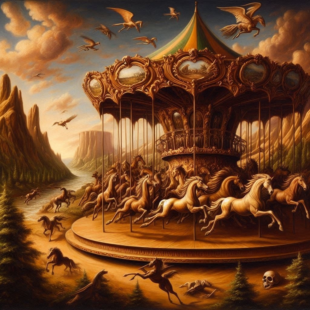 los caballos dan vueltas como un grato carrusel,