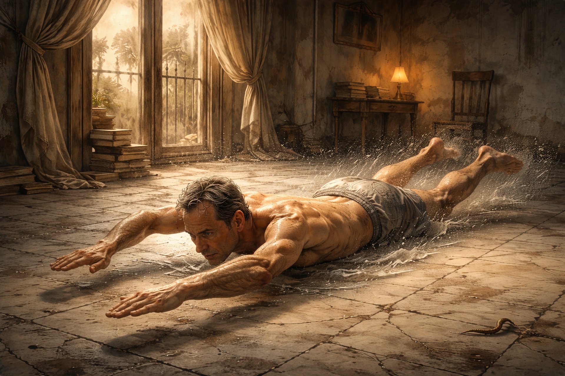 El mármol —superficie fría, pétrea— funciona como símbolo de un mundo endurecido, carente de fluidez. Nadar sobre él implica convertir la rigidez en campo de acción. La práctica absurda se vuelve forma de agencia. No hay transformación del entorno; hay transformación del gesto.