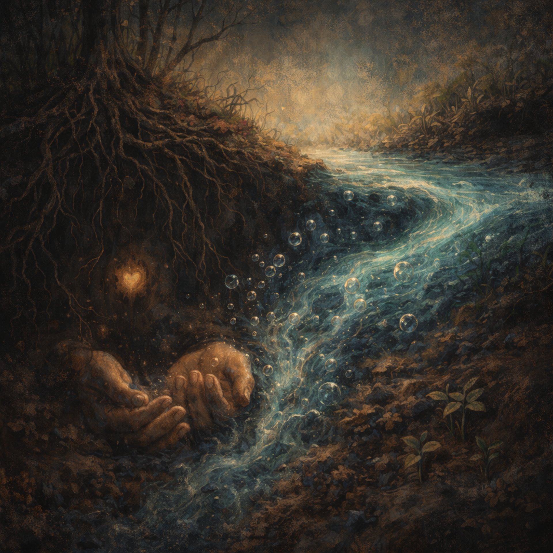 No es silencio, es un río subterráneo que cambia de cauce, que pulsa bajo la piel como una raíz ciega que siente la primavera antes de tiempo. En la espera, la vida se retira, no para morir, sino para aprender su nombre. Los latidos se vuelven gotas, las manos se cierran como semillas bajo la tierra que sueña. Todo se ralentiza, pero nada se detiene. Se mueven los flujos invisibles: burbujas de gas suben desde el fondo, se inflan y estallan por dentro, trayendo nuevas memorias para nacer. Bajo el esternón, un corazón primitivo comienza a formarse de nuevo, como si fuera la primera vez. Las piernas, las manos, los ojos: se dibujan otra vez en la oscuridad, aún no caminan ni ven, pero ya sienten. Es la fábula que regresa. El primer juego que nos inició, aquel que no recordamos pero que llevamos encima como un eco en las muñecas. En la espera, la piel se vuelve pergamino, y sobre ella se escribe la historia del cuerpo que fuimos y del que estamos llegando a ser.